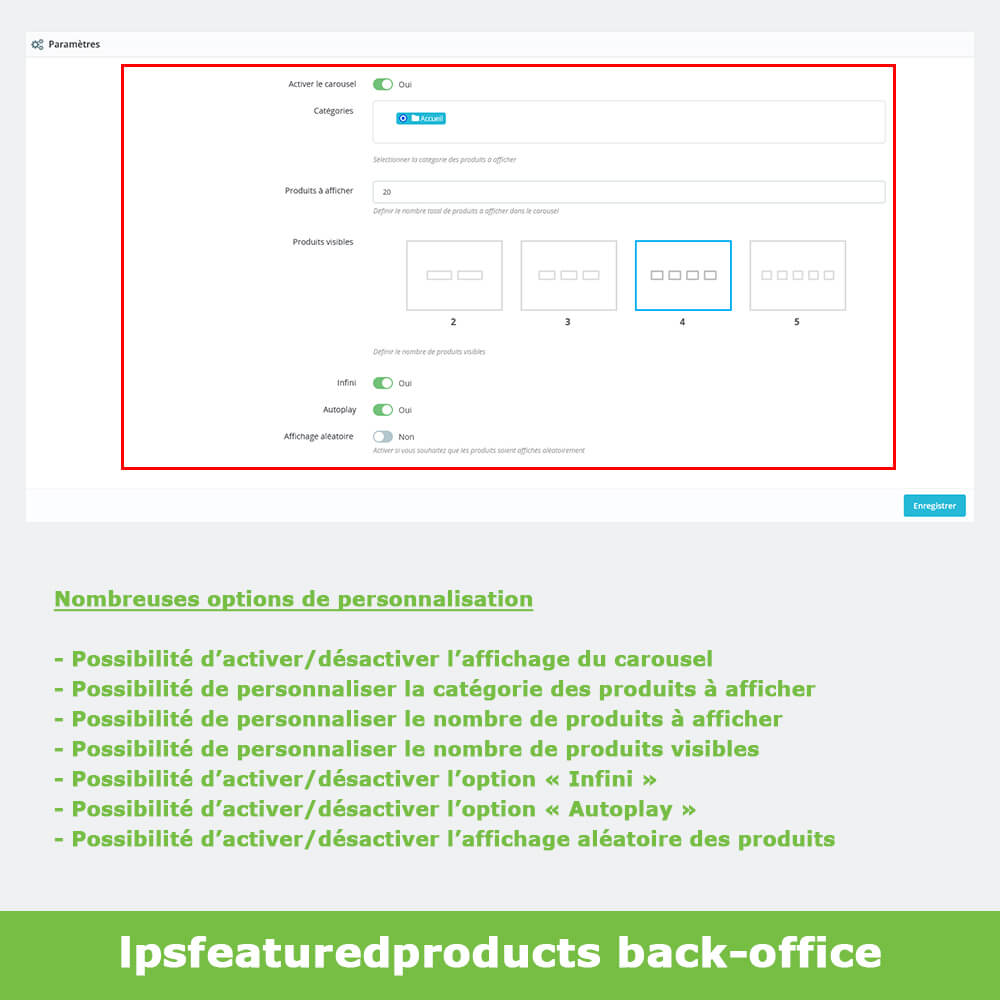 Le module lpsfeaturedproducts vous permet de personnaliser la catégorie et le nombre de produits à afficher dans le carousel ainsi que le nombre de produits visibles.